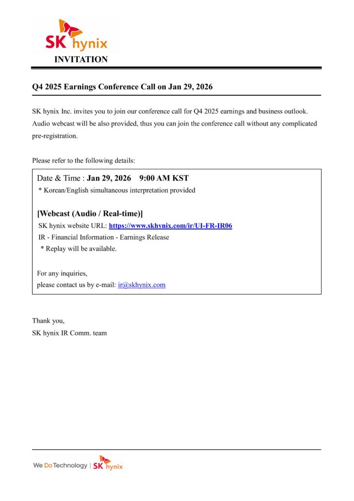 SK海力士将于2026年1月29日(周四)发布截止2025年12月31日的2025年第四季度财务报告。